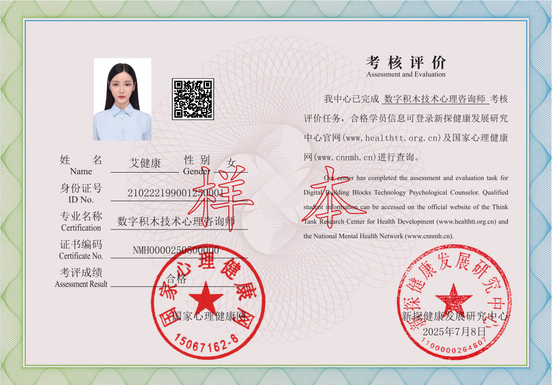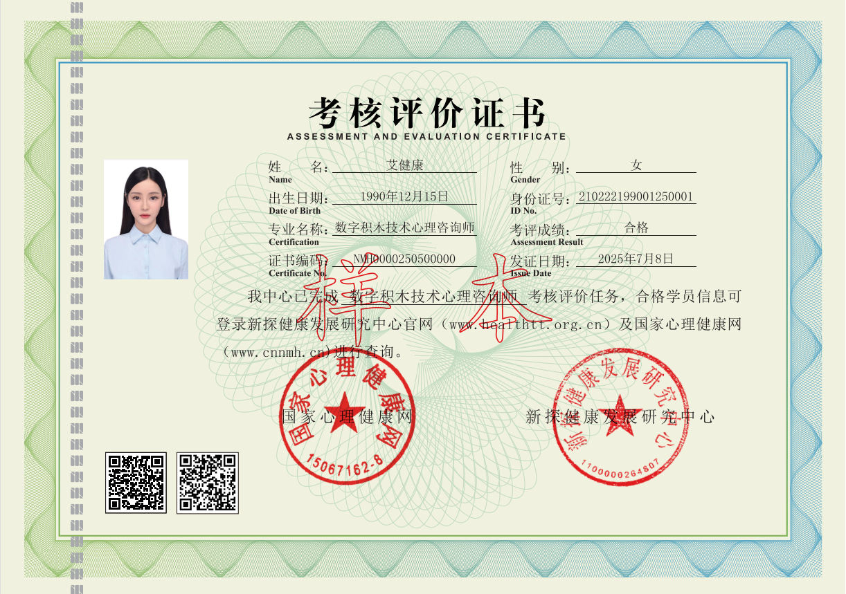第四步:考核合格者信息录入国家心理健康网证书查询系统,由新探健康发展研究中心、国家心理健康网颁发相应证书,并出具考核评价报告。