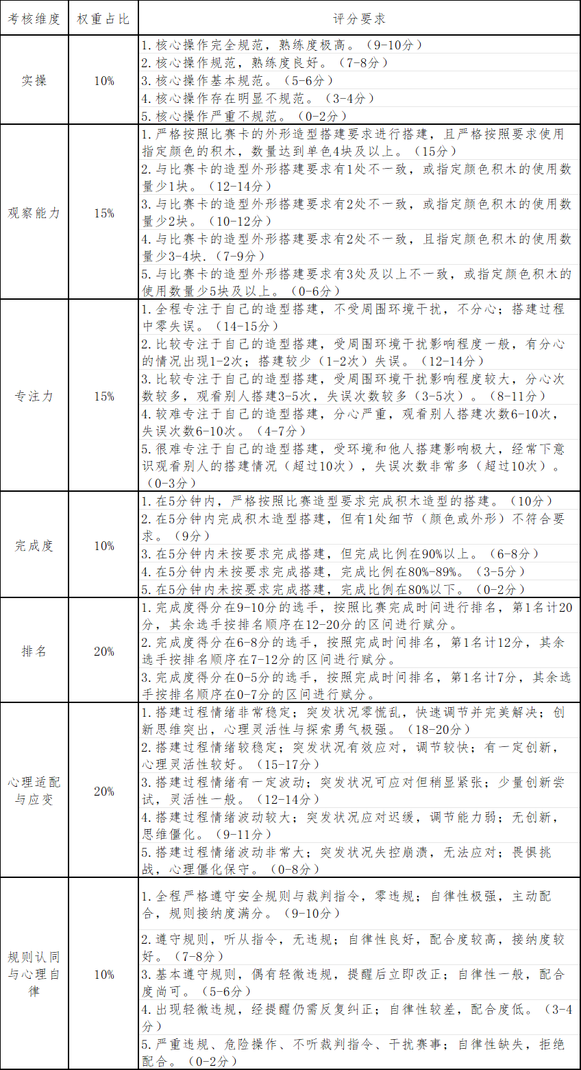 组委会可根据现场实际情况对候场、备赛、轮候等细节进行调整,确保公平公正。比赛积木由组委会统一提供(规格:6cm×3cm×1cm)。