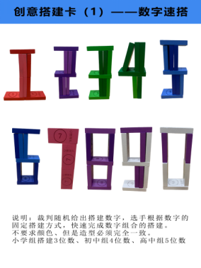 比赛要求:裁判随机给出搭建数字,选手根据数字的固定搭建方式,快速完成数字组合的搭建。(小学组搭建3位数、初中组4位数、高中组5位数)